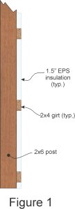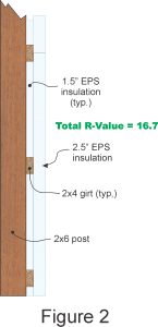 EPS.  Since we can manufacture the sheets in any thickness, you can accurately achieve your desired R-Value.  See Figure 2.  The outer layer of EPS can easily be fastened with Loctite PL Premium Construction Adhesive.  We can also supply 1”x 2”x 96” strips that can be glued over the seams, which gives the wall a “board and batten” appearance.  Then simply finish the EPS with a good acrylic paint.