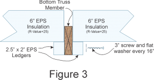 For ceilings, we’ve come up with a proprietary design that is easy to install and cost effective.  Take a look at Figure 3.  By fastening EPS ledgers on both sides of the lower truss members, you create a sturdy support system for thick EPS panels.  The advantages are: